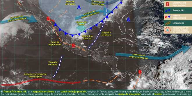 Para este domingo se pronostican lluvias intensas (de 75 a 150 milímetros [mm]) en Hidalgo, Puebla (norte) y Veracruz (norte); muy fuertes (de 50 a 75 mm) en Nuevo León, Tamaulipas, San Luis Potosí, Guanajuato, Querétaro, Oaxaca, Chiapas y Tabasco; fuertes (de 25 a 50 mm) en Chihuahua, Durango, Coahuila, Zacatecas, Aguascalientes, Michoacán, Estado de …