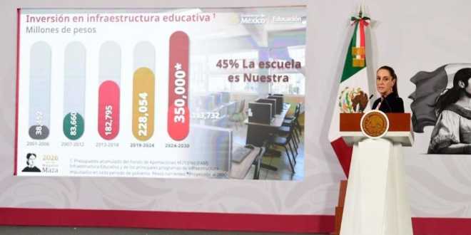 La actual administración federal proyecta una inversión de 350 mil millones de pesos en infarestrctura educativa, que incluye el programa La Escuela es Nuestra y la Universidad Rosario Castellanos. La presidenta Claudia Sheinbaum reiteró que la educación es un derecho, siendo la esencia de la Cuarta Transformación. “En el sexenio vamos a invertir 350 mil …